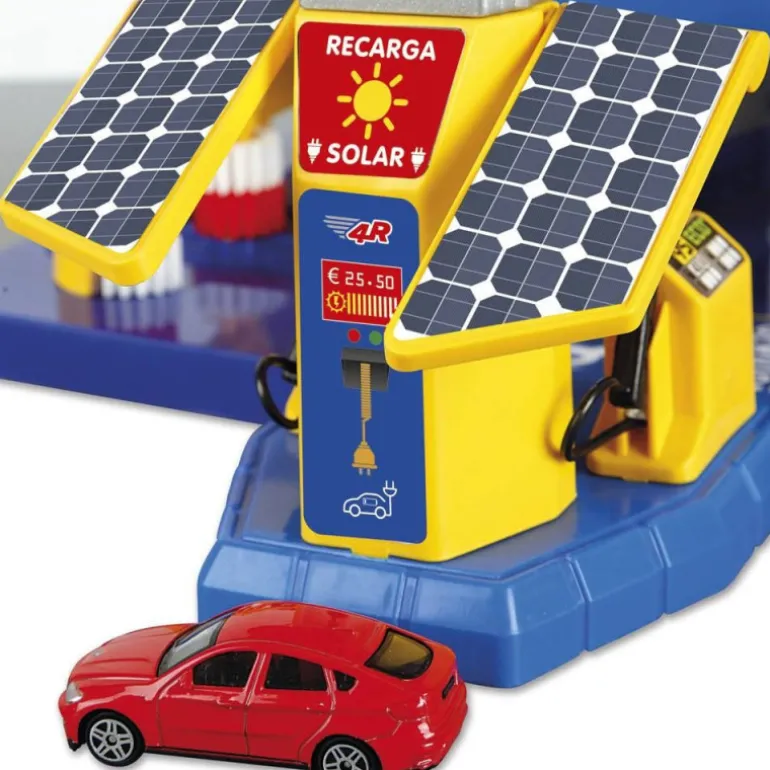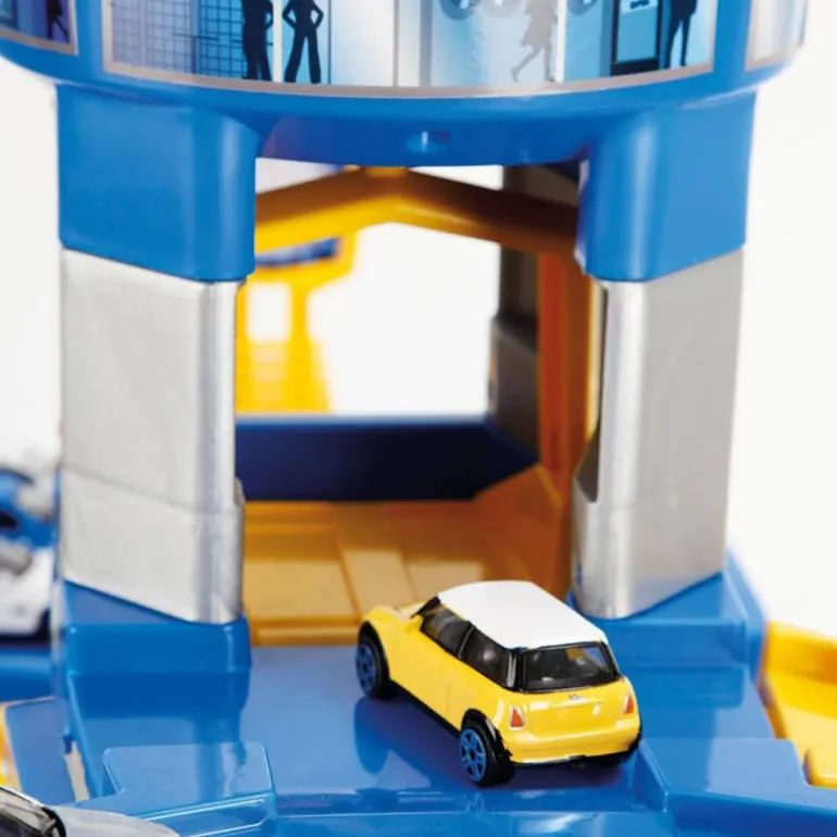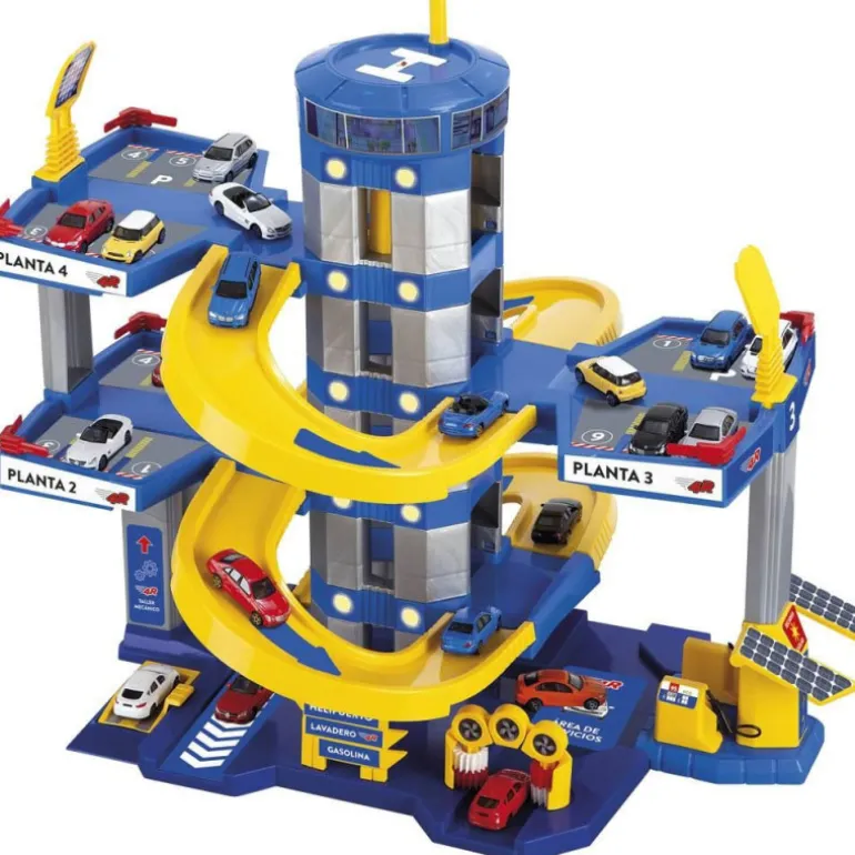 Baja por las rampas hasta la gasolinera, revisa el coche en el taller, después un buen lavado, cogemos el ascensor y al restaurante para comer. ¡Tenemos preparado el helicóptero para visitar la ciudad! Los coches no están incluidos, se venden por separado. Escala 1:50. Fabricado en España.