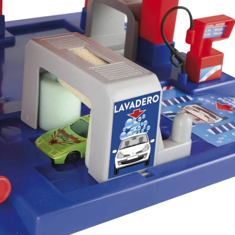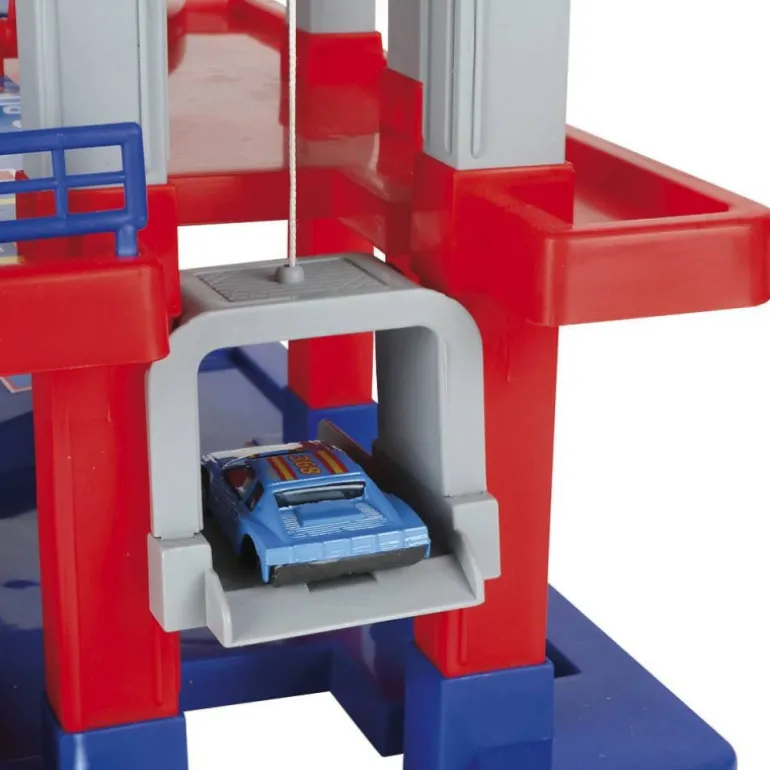 Sube por el ascensor, aparca, baja por la rampa, reposta en la gasolinera y lava el coche en el lavadero. Además, incluye dos coches con los que podrás jugar durante horas. Escala 1:58. Fabricado en España.
