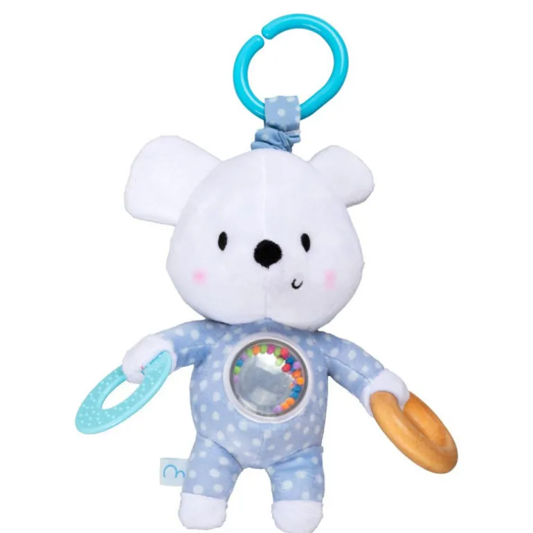 Tiene un sonajero en la tripita. Incluye 2 mordedores. Al tirar del cordón superior, comienza a vibrar.