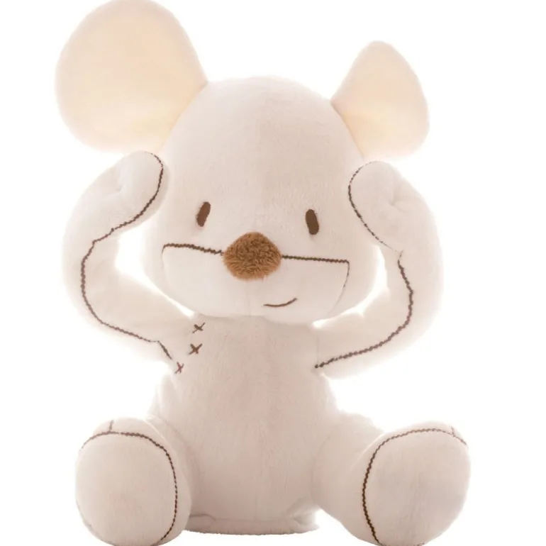 Aprieta el pie derecho o izquierdo del peluche para que toque una melodía o se ría mientras esconde su carita.
