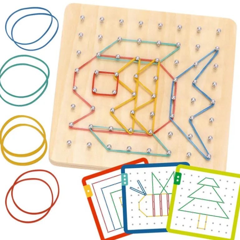 Una forma diferente de dibujar y desarrollar la creatividad. Mediante las tarjetas con patrones geométricos los niños tendrán que poner a prueba su ingenio y su visión espacial para reproducirlos mediante gomas elásticas de colores.