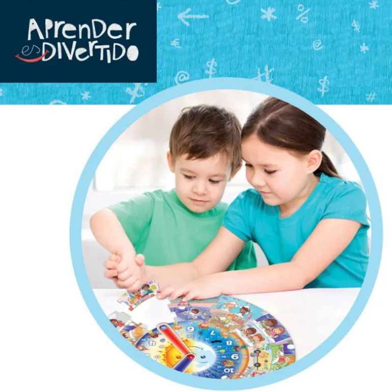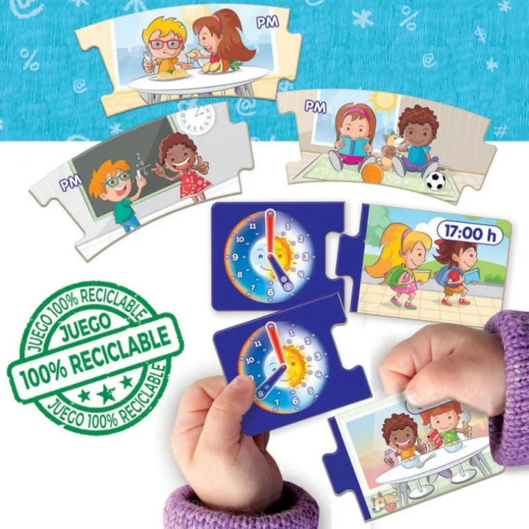 Contenido: 1 reloj montable, 39 piezas de hora y escena encajables alrededor del reloj, 12 parejas de piezas de hora analógica y hora digital, instrucciones.