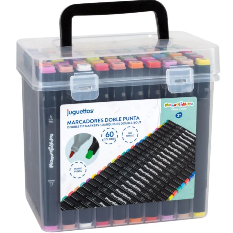 Maletín con 60 marcadores de doble punta en una amplia variedad de colores. Perfectos para colorear, dibujar y crear detalles precisos o trazos amplios. Desarrolla la creatividad y ejercita la habilidad manual.