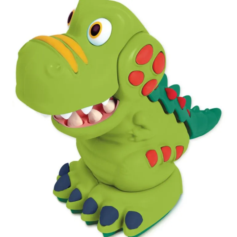Estructura en forma de dinosaurio, con moldes incorporados para adornarlo. Incluye herramientas para hacer de dentista con su gran boca, así como moldes de figuras para crear un mundo de dinosaurios. Favorece la