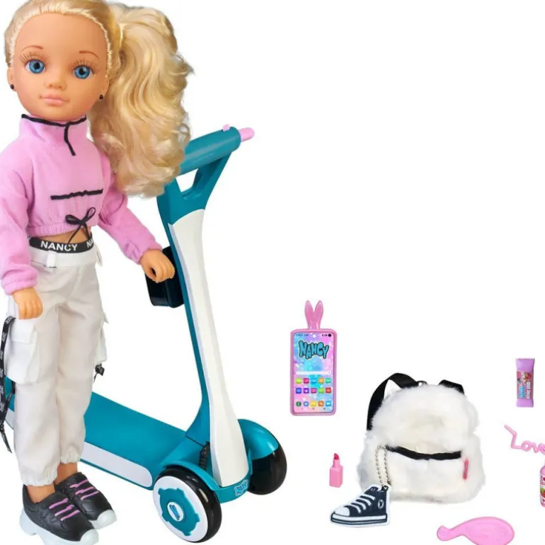 Las luces de la rueda trasera se encienden cuando están en movimiento y su móvil se enciende cuando se coloca en el soporte del patinete. Además, Nancy se puede sujetar al scooter mientras conduce. Nancy tiene el pelo rubio con una coleta lateral y lleva un look de moda (sudadera corta, pantalones y zapatillas que están muy de moda) y una mochila de peluche con accesorios: móvil, cepillo, pintalabios y bebida con pajita en forma de LOVE.