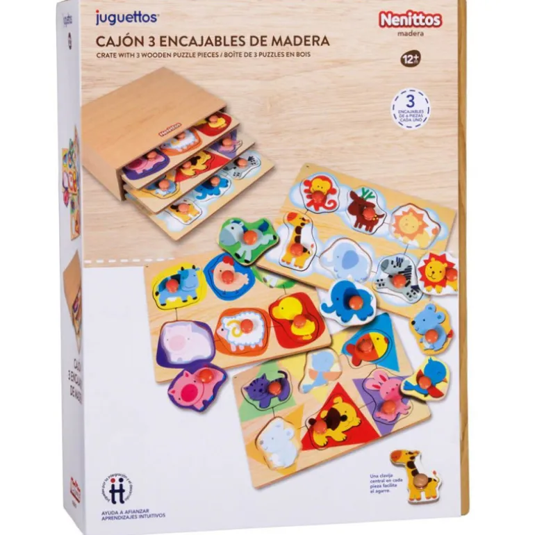 3 encajables de madera con el que tu bebé aprenderá a asociar conceptos y a diferenciar distintas formas.
