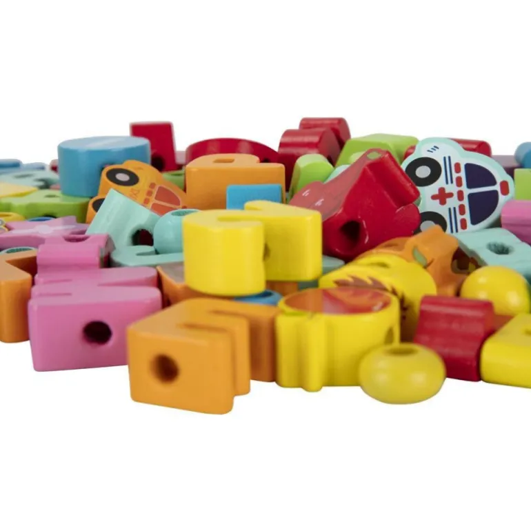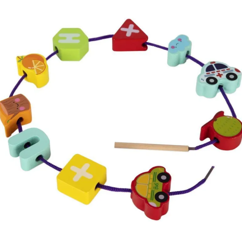Con este juego, niños y niñas aprenderán a controlar y mejorar su movilidad en manos y dedos, ensartando y anudando. También aprenderán a identificar colores, formas, letras y números.