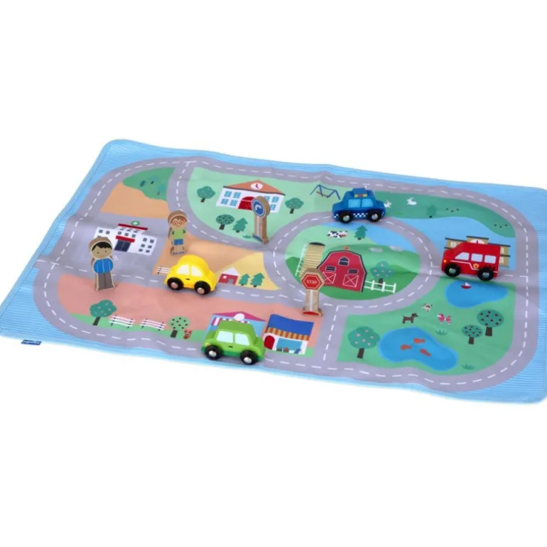 Tapiz de tela para el suelo que representa una ciudad con calles y algunos lugares destacados como el parque, ayuntamiento y hospital. Desarrolla la imaginación y favorece el juego compartido, así como el conocimiento de las señales básicas de tráfico y primeras normas de circulación.