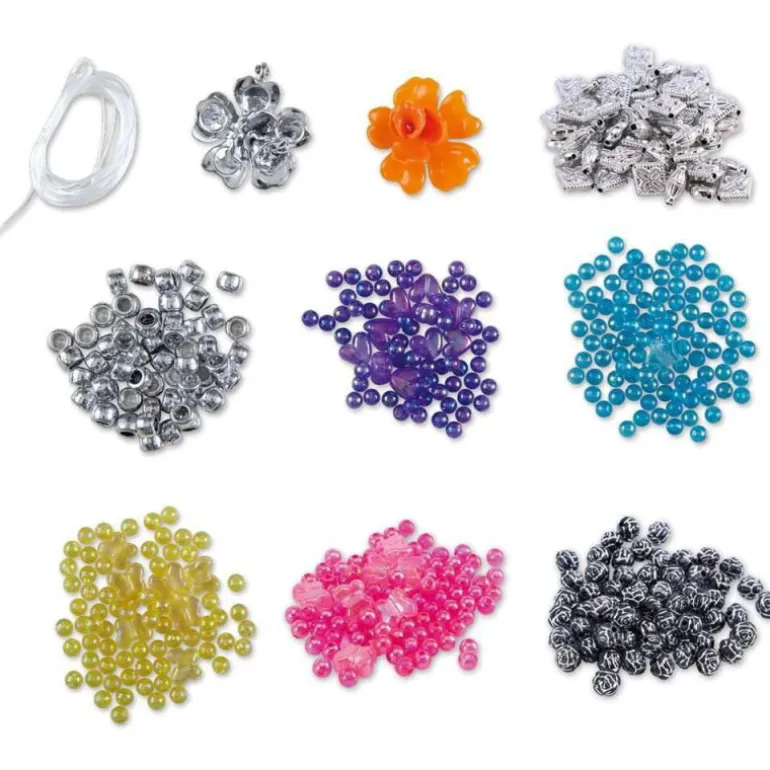 Con este set de cuentas y abalorios podrás hacer tus propias joyas. Incluye 2 abalorios grandes con forma de flor para decorar tus pulseras.