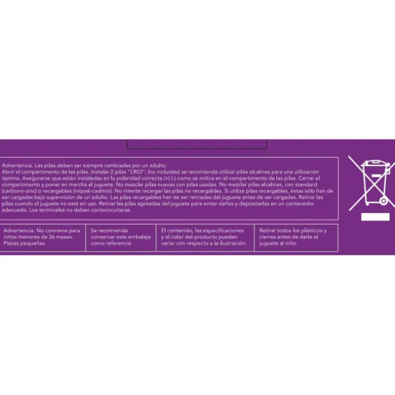 Las pilas deben ser siempre cambiadas por un adulto: abrir el compartimento de las pilas. Instalar 2 pilas LR03 (no incluidas) se recomienda utilizar pilas alcalinas para una utilización óptima. Asegurarse que están instaladas en la polaridad correcta + – como se indica en el compartimento de las pilas. Cerrar el compartimento y poner en marcha del juguete. No mezclar pilas nuevas con pilas usadas, No mezclar pilas alcalinas, con standard carbono-zinc o recargables níquel-cadmio. No intente recargar las pilas no recargables. Si utiliza pilas recargables, éstas sólo han de ser cargadas bajo supervisión de un adulto. Las pilas recargables han de ser retiradas del juguete antes de ser cargadas. Retirar las pilas cuando el juguete no esté en uso. Retirar las pilas agotadas del juguete para evitar daños y depositarlas en un contenedor adecuado. Los terminales no deben cortocircuitarse.