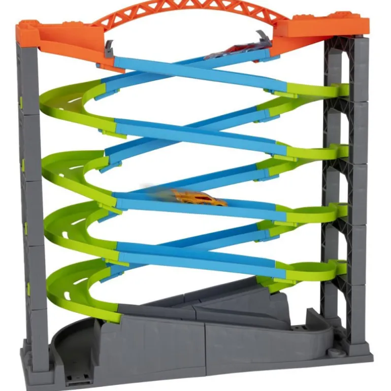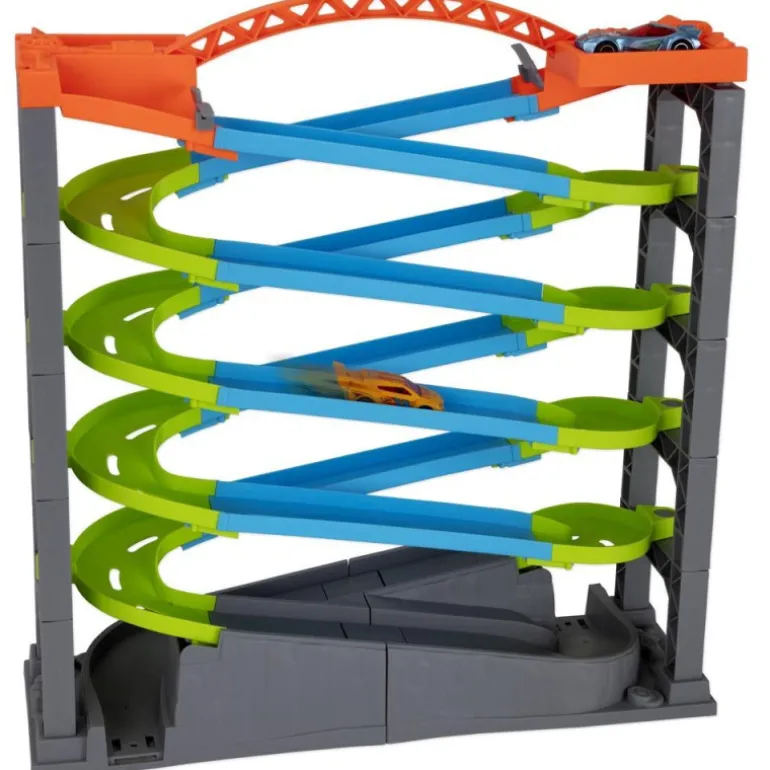 Gran circuito de 10 rampas compacto y sencillo, que permite lanzar los coches a toda velocidad. Incluye asa para transportarlo y 2 coches deportivos. Desarrolla la imaginación y favorece el juego compartido.