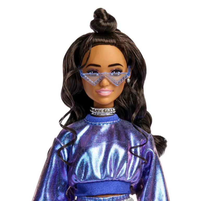Barbie Deluxe Style nº 7 Muñeca Morena con Conjunto de Ropa Azul Metalizado y Accesorios
