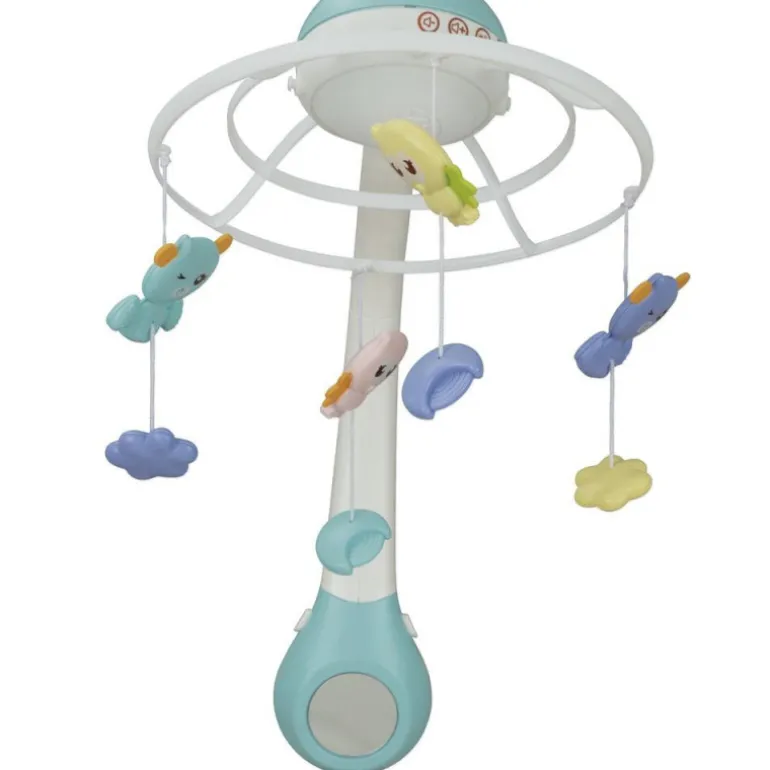 Móvil de cuna 3 en 1 con proyector de imágenes de estrellas, luz de noche y 4 animalitos colgantes. Emite sonidos de animales y de la naturaleza, o melodías relajantes para conciliar el sueño. Incluye mando a distancia para escoger diferentes funciones, programar el tiempo de funcionamiento y control de volumen. Estimula la discriminación visual y auditiva y favorece la conciliación del sueño y la calma.