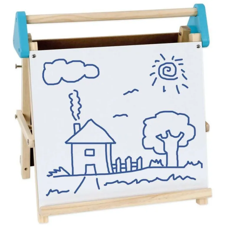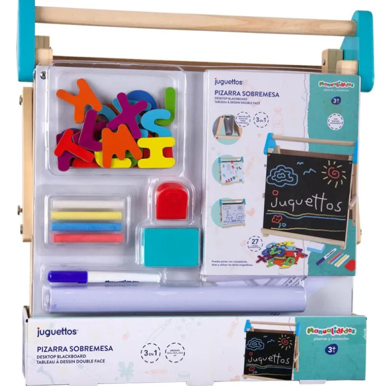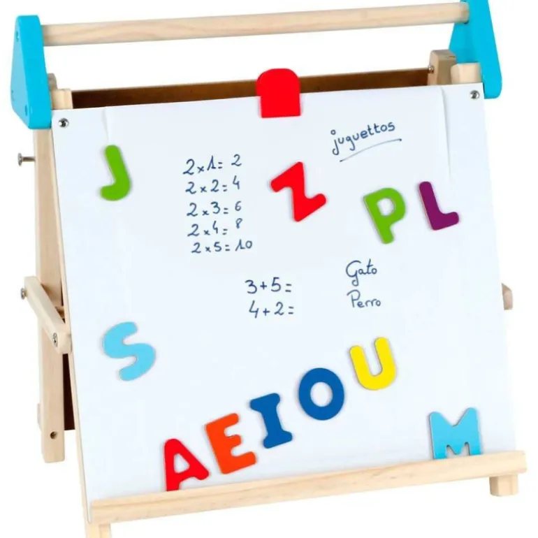 Colócala sobre una mesa y podrás empezar a dibujar. Tiene un lado donde podrás colocar las letras magnéticas y dibujar con el rotulador incluido y otro lado en el que podrás dar rienda suelta a tu imaginación utilizando las tizas. Además incluye un rollo de papel continuo y una pinza para sujetarlo, así tu pizarra se convertirá en caballete.