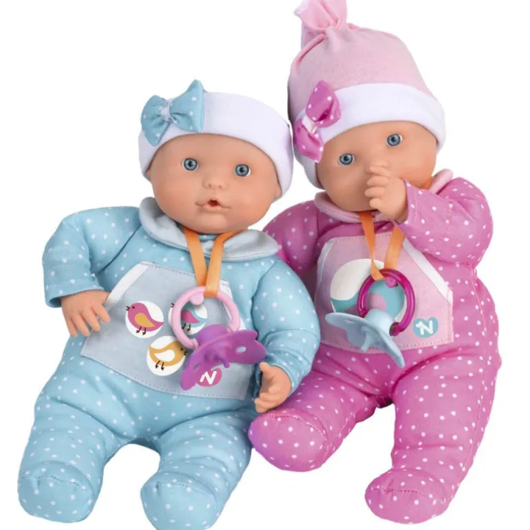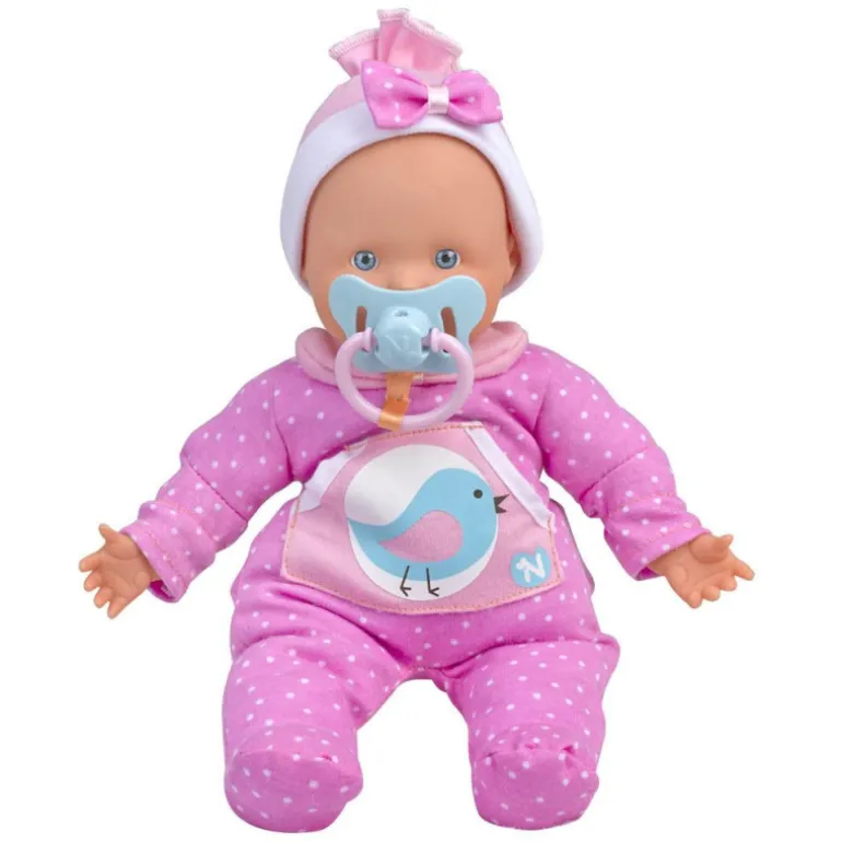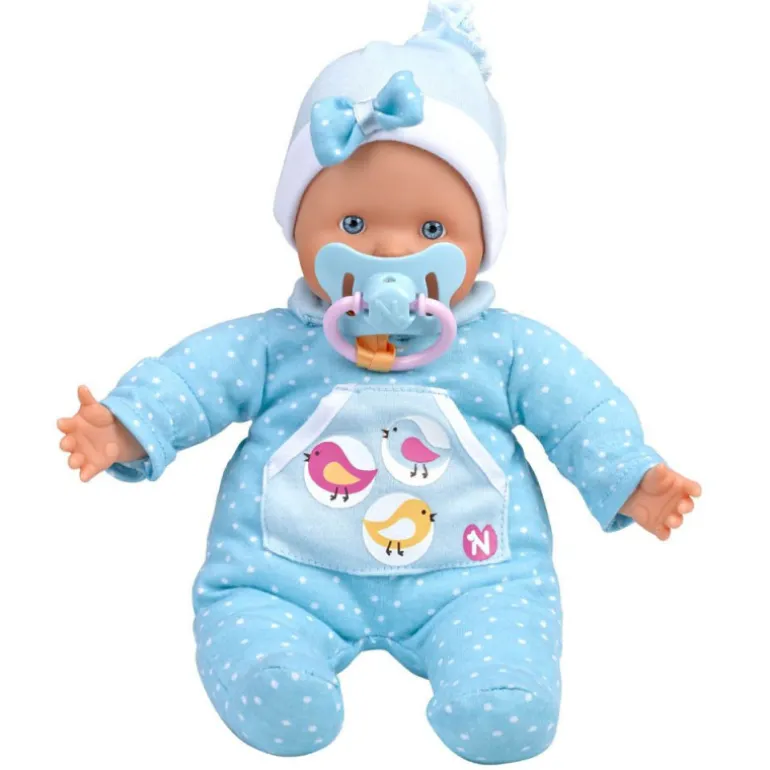 Muñeco blandito con vestido decorado con pajaritos y un gorrito. Si le das el chupete hará soniditos de chuparlo, pero si se lo quitas se podrá a llorar! Además se mete el dedito en la boca como los bebés de verdad!