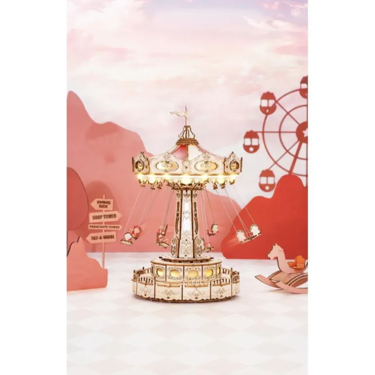 Además, encontramos dos zonas iluminadas, en la parte de arriba y la base del carrusel. Además cuenta con una columna con espejos que le da un acabado único.